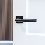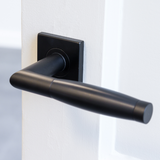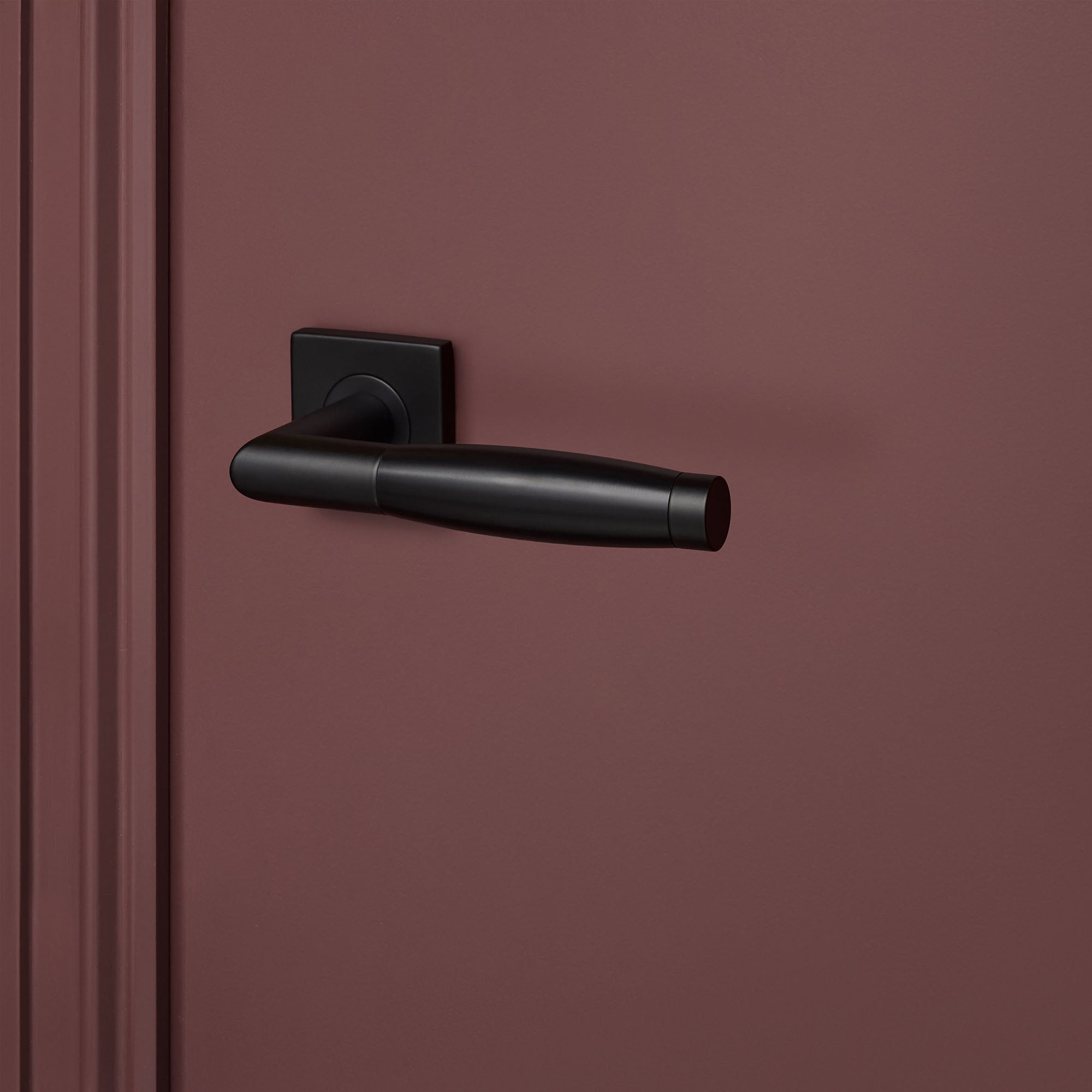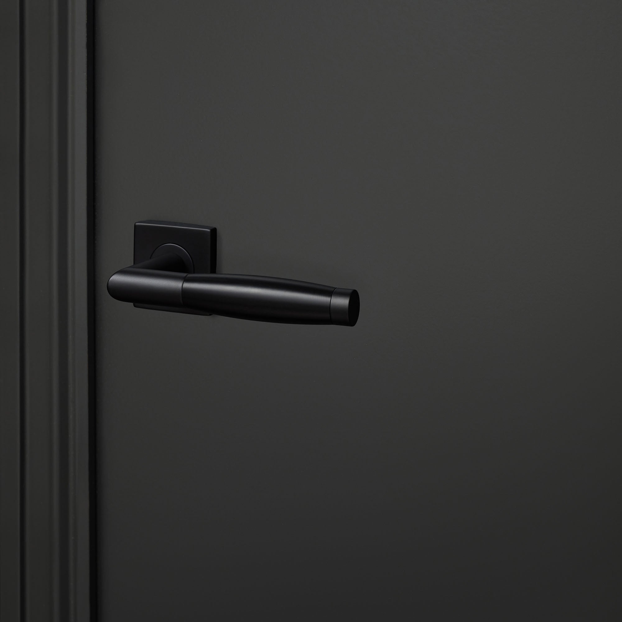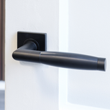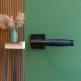 Het vierkante rozet geeft de deurklink een eigentijdse en stoere uitstraling, terwijl de matte zwarte afwerking een luxe en verfijnde uitstraling biedt. Het strakke, minimalistische ontwerp maakt deze deurklink een ideale keuze voor interieurs die een moderne en ingetogen uitstraling verlangen, terwijl het ook uitstekend past bij meer klassieke of landelijke stijlen.