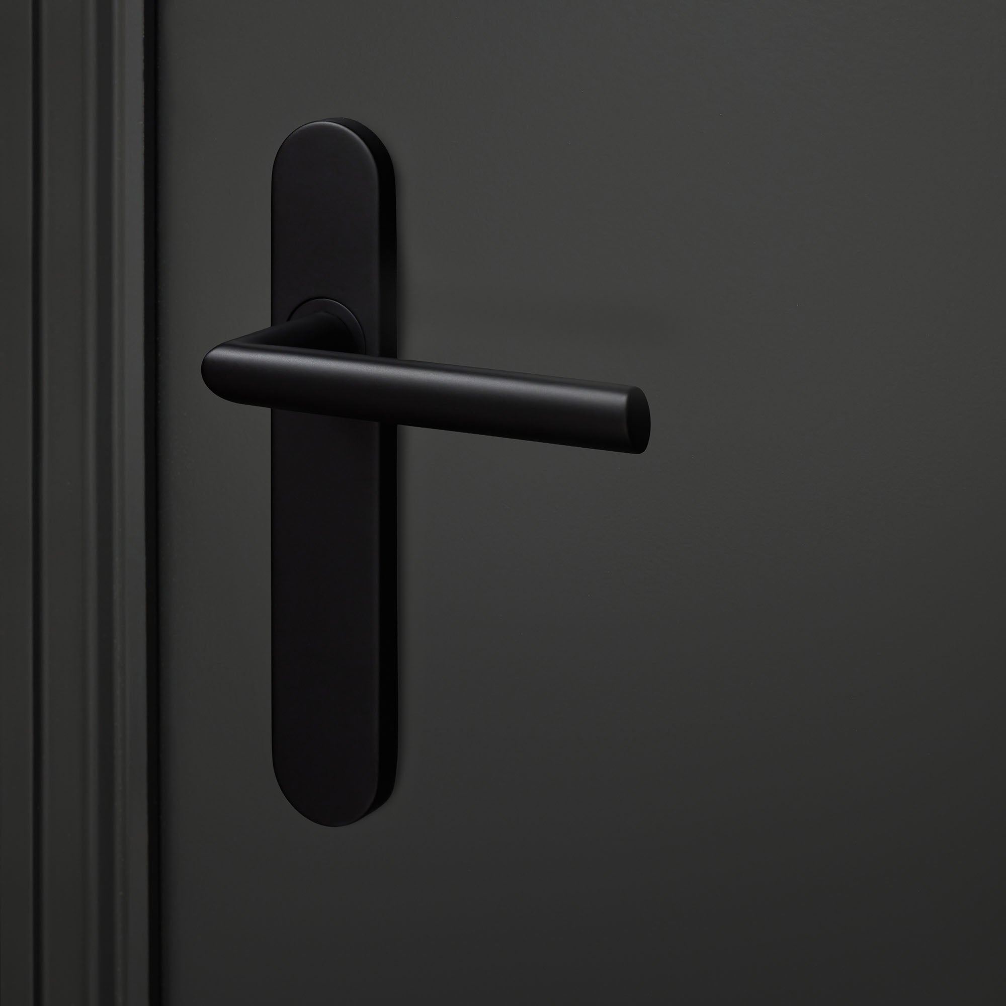 Deze uitvoering is geschikt voor binnendeuren zonder slot. Het afgeronde schild sluit netjes aan op het design van de klink en zorgt voor een harmonieus totaalbeeld. De matzwarte coating is slijtvast en past moeiteloos bij andere zwarte accenten in huis.