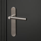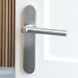 De klink loopt subtiel taps toe en ligt prettig in de hand. Het afgeronde schild zorgt voor een nette overgang op de deur en bedekt eventuele oude boorgaten. De combinatie van vorm en afwerking zorgt voor een verzorgde en moderne uitstraling.