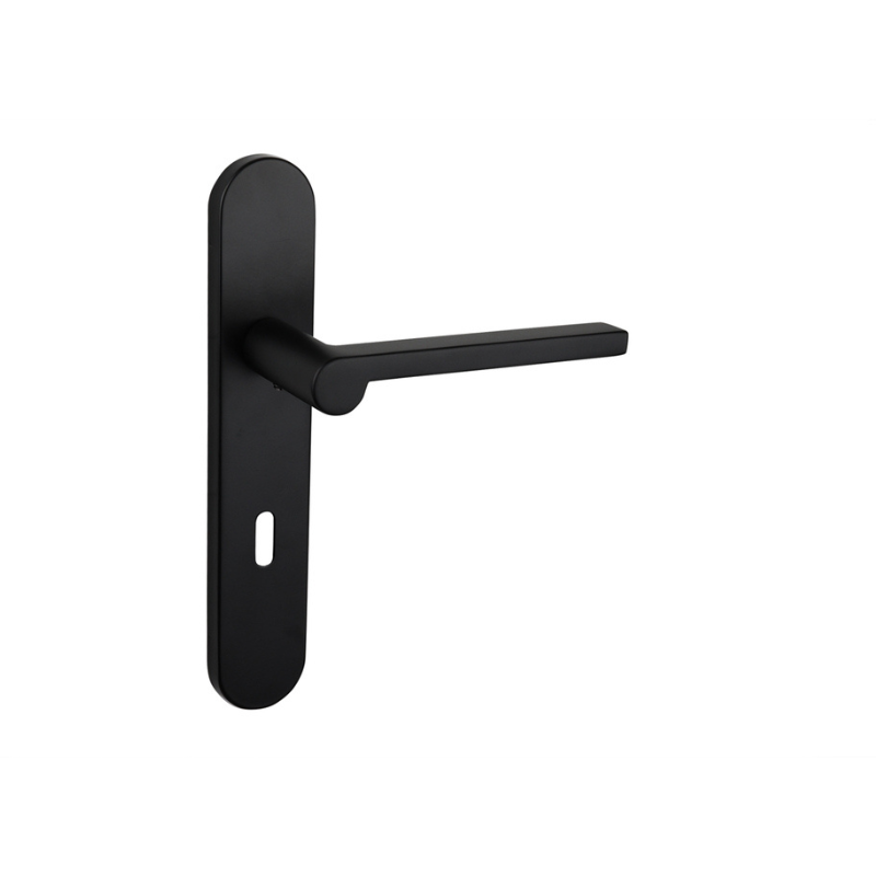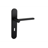 De klink loopt vloeiend over in de bovenkant van het handvat en ligt comfortabel in de hand. Het afgeronde schild zorgt voor een zachte overgang op de deur en biedt een verzorgde afwerking. De matzwarte kleur geeft de klink een krachtig, stijlvol karakter.