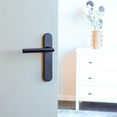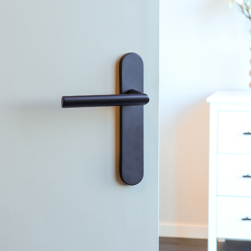 Deze uitvoering is geschikt voor binnendeuren zonder slot. Het afgeronde schild sluit netjes aan op het design van de klink en zorgt voor een harmonieus totaalbeeld. De matzwarte coating is slijtvast en past moeiteloos bij andere zwarte accenten in huis.