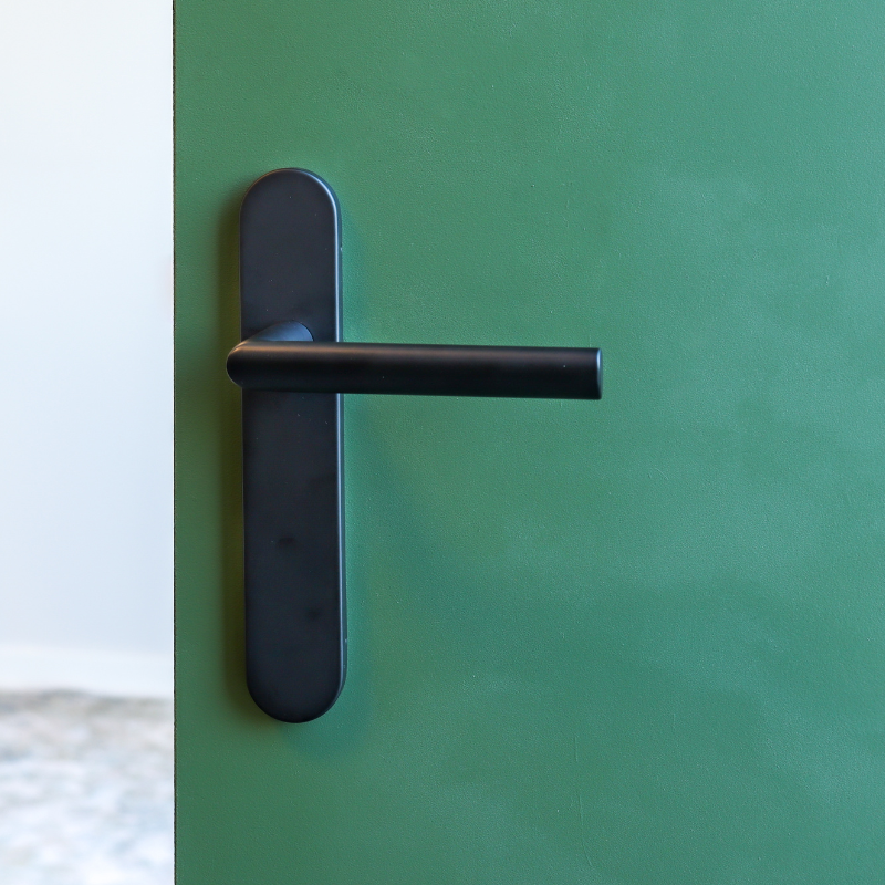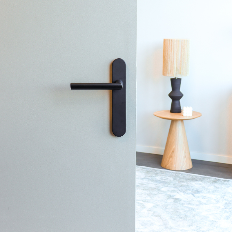 De Ragusa deurklink in het zwart met afgerond schild is allesbehalve standaard. Het eerste wat opvalt, is de schuine handgreep: een subtiele draai in het ontwerp die zorgt voor een verrassend comfortabele grip. Combineer dat met een matzwarte afwerking, en je krijgt een klink die strak, speels én stijlvol is.